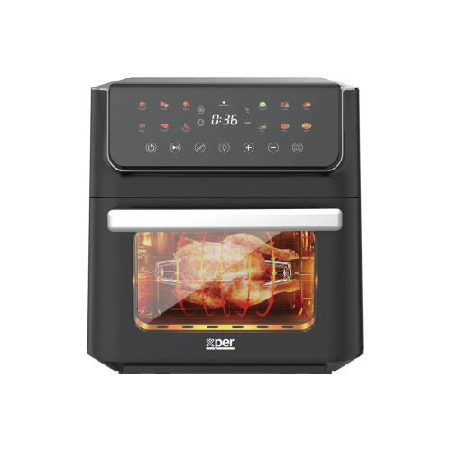مع قلاية بدون زيت وفرن اكسبير بسعة 12 لتر وقوة 1800 واط مع شاشة لمس و12 وظيفة، استمتع بتحضير وجباتك المفضلة بطريقة صحية، سريعة، ومتنوعة بفضل تقنية الهواء الساخن والتوزيع الذكي للحرارة.