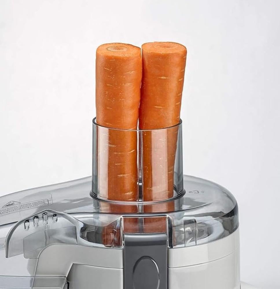 - مجرى تغذية 60 ملم: يسمح بتمرير قطع الفواكه والخضروات الكبيرة بسهولة، مما يقلل من الحاجة للتقطيع المسبق.