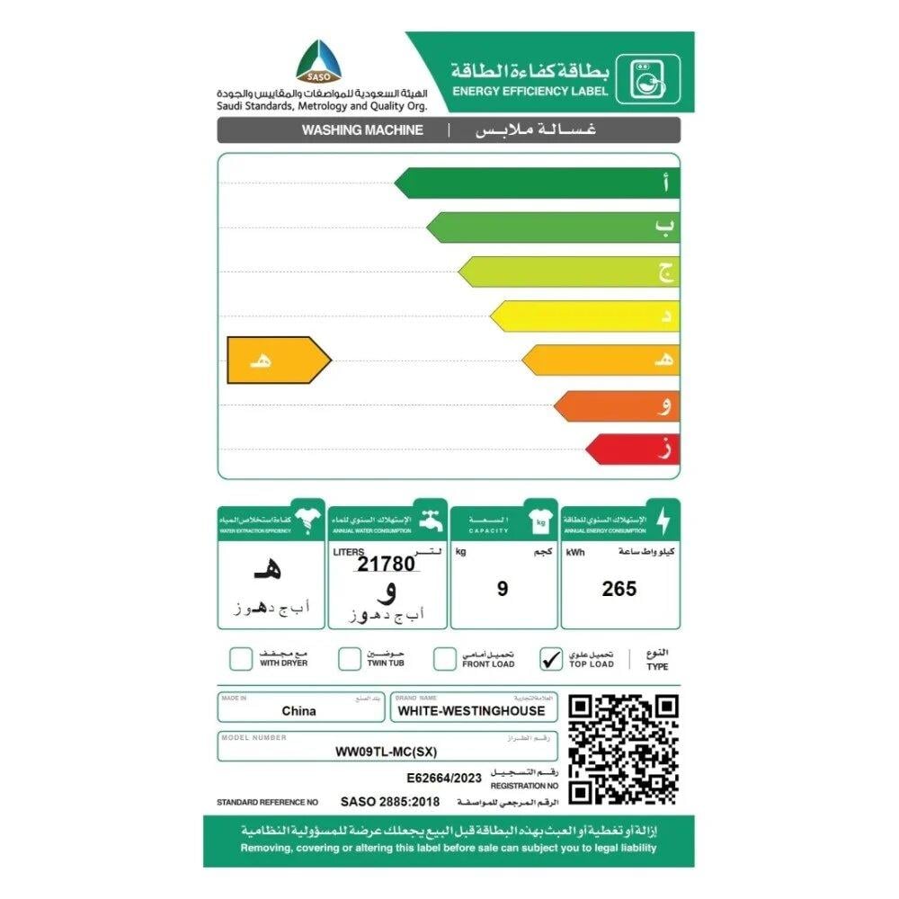 غسالة وايت ويستنجهاوس , تحميل علوي من الفولاذ المقاوم للصدأ 670 دورة في الدقيقة , سعة 9 كجم , موديل  WW09TL-MC(SX)