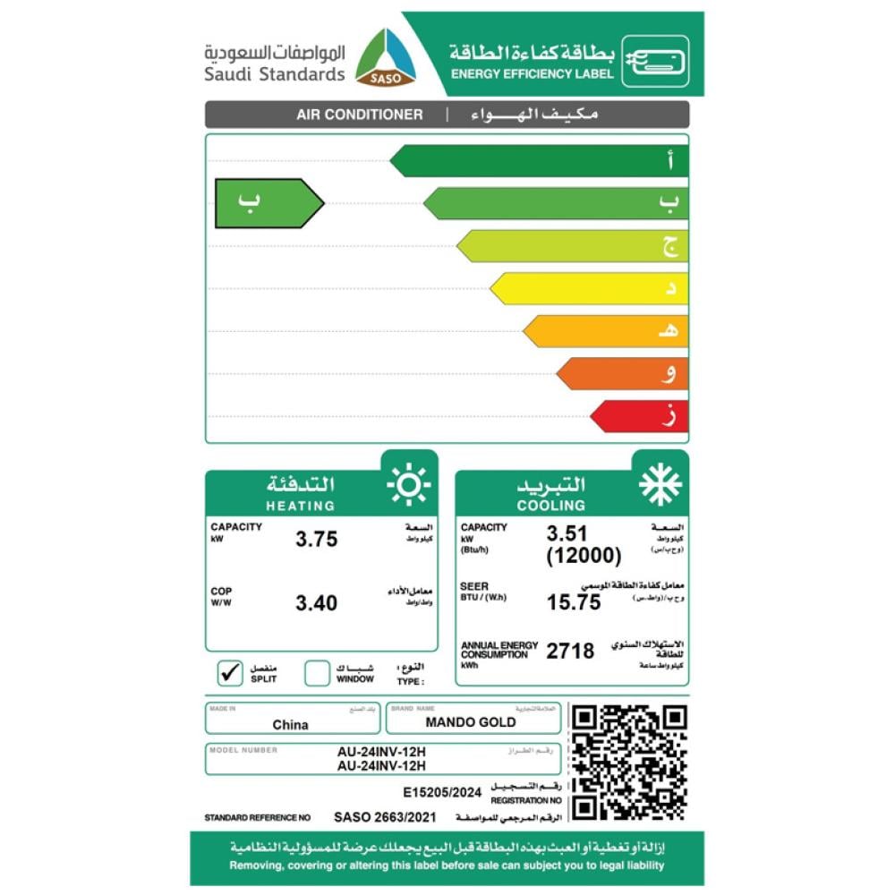 مواصفات مكيف ماندو جولد سبليت 12000 وحدة بارد وحار مع انفرتر: