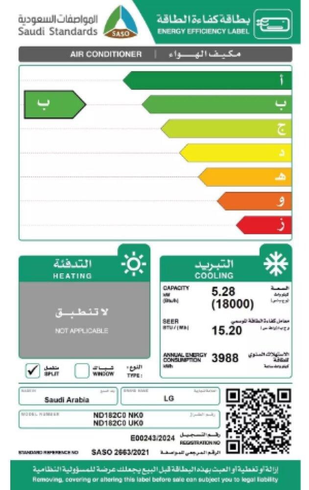 - القدرة التبريدية: 1.5 طن (18000 وحدة حرارية BTU)