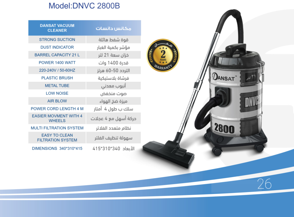 هل تعاني من ضعف الشفط أو صعوبة تنظيف منزلك؟ وداعًا لتلك المشكلة مع مكنسة كهربائية دانسات 1400 واط التي تمنحك قوة شفط هائلة ونظافة عميقة بلا مجهود. تصميمها المبتكر. دانسات مكنسة برميل 21 لتر يجعل التنظيف مستمر وفعال دون الحاجة لتفريغ متكرر. مع مكنسة دانسات استمتع بنظام متعدد الفلاتر لصحة أفضل وصوت منخفض يمنحك راحة أثناء العمل.